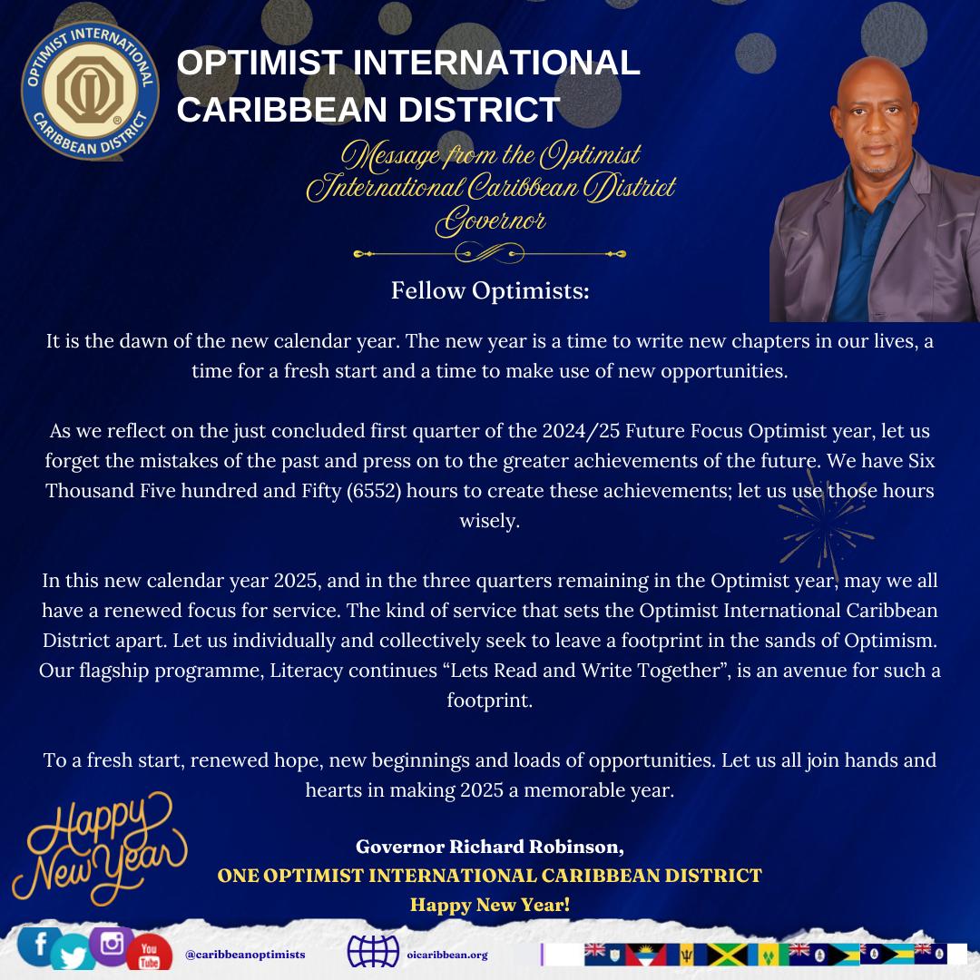 District Governors New Year Message It’s the dawn of the new calendar year. The new year is a time to write new chapters in our lives, a time for a fresh start and a time to make use of new opportunities. As we reflect on the just concluded first quarter of 2024/25 Future Focus Optimist year, let us forget the mistakes of the past and press on to the greater achievements of the future. We have Six Thought Five Hundred and Fifty Two (6552) hours to create these achievements; let us use those hours wisely. In this new calendar…