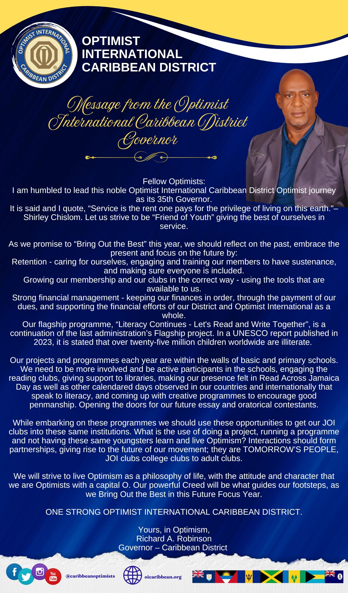 The Optimist International Caribbean District (OICD) is led by the District Governor who is supported by a talented team of individuals dedicated to the Optimist Movement. Keep with the latest news and information from the District Governor.